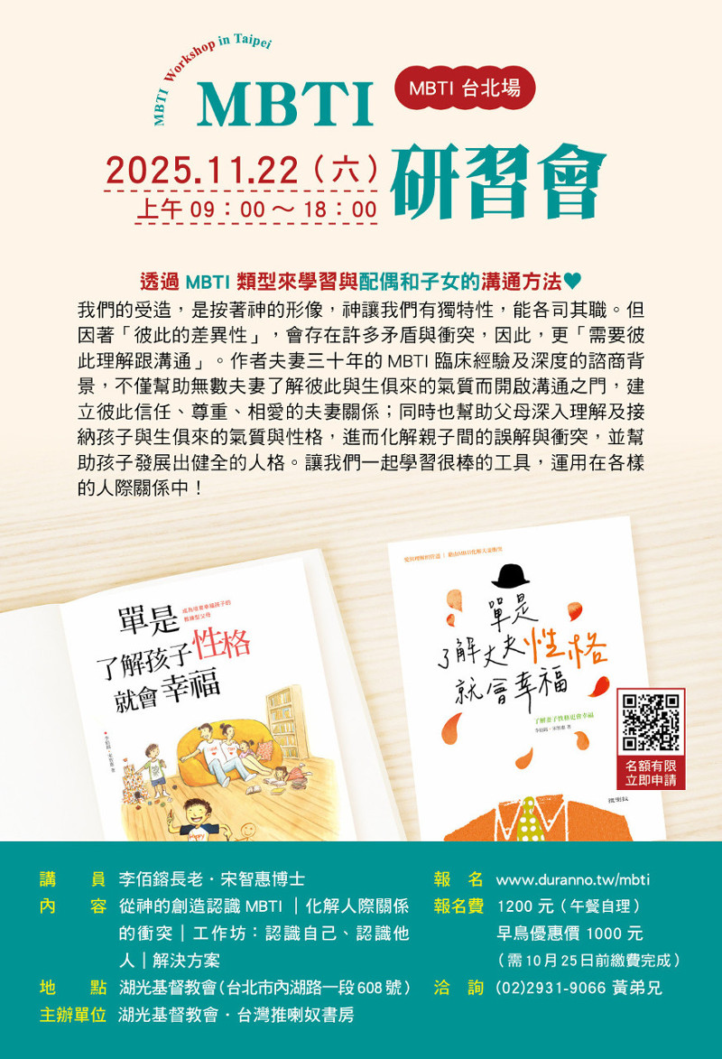 我們的受造,是按著神的形像,神讓我們有獨特性,能各司其職。但因著「彼此的差異性」,會存在許多矛盾與衝突,因此,更「需要彼此理解跟溝通」。作者夫妻三十年的MBTI 臨床經驗及深度的諮商背景,不僅幫助無數夫妻了解彼此與生俱來的氣質而開啟溝通之門,建立彼此信任、尊重、相愛的夫妻關係;同時也幫助父母深入理解及接納孩子與生俱來的氣質與性格,進而化解親子間的誤解與衝突,並幫助孩子發展出健全的人格。讓我們一起學習很棒的工具,運用在各樣的人際關係中!